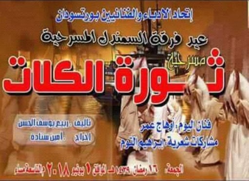 منع جهاز الأمن ببورتسودان عرض مسرحية "ثورة الكلات" التي كان من المقرر عرضها بمسرح إتحاد الأدباء والفنانين إحتفتاءً وإحتفالاً بالعيد الـ 29 لفرقة السمندل المسرحية.